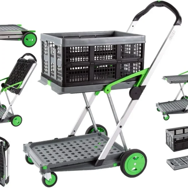 The consists of aluminium and high-quality synthetics. Just by pushing a single button it can be folded or unfolded within seconds. Folded up, it can be easily carried or stored away in a practical manner. As the upper loading area is approx. 130° foldable upwards, it allows for the transport of higher goods on the lower level.